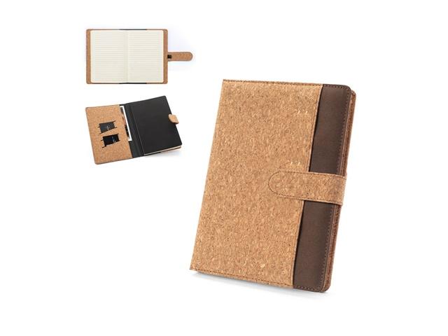 A5 mapa s blokom koji se može ukloniti radi bolje organizacije. Korice su od pluta i recikliranog poliestera (100% rPET). Sastoji se od: 1 džepa od pluta i recikliranog poliestera, kvadratnog hrpta, zaobljenih kutova, unutarnje pjene za ugodnije rukovanje, magnetska traka za zatvaranje e i držača za olovku (nije uključena). Unutrašnjost, od pluta i podstava od poliestera, sadrži: 2 džep od pluta, 4 pretinca za kartice i 1 blok, izrađen od FSC™ certificiranog materijala i drugih kontroliranih materijala, s fleksibilnim koricama i 192 stranice boje slonovače s crtama (70 g/m²). Budući da je proizvod izrađen od prirodnih materijala, boja te rezultat ispisa mogu se razlikovati od proizvoda do proizvoda