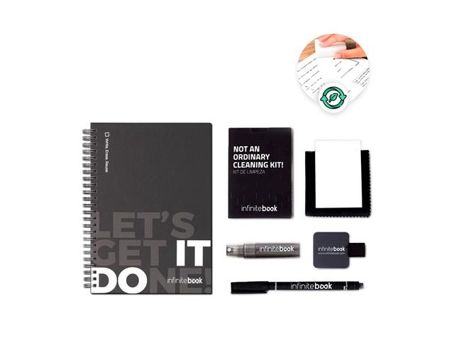 “Infinitebook” A5 Starter Kit omogućuje vam da lako izbrišete sve što napišete i započnete ispočetka koliko god puta želite. Sastoji se od “Infinitebooka” s tvrdim koricama i prstenovima, 1 kompleta za čišćenje (prazna bočica s raspršivačem, spužva i 1 krpica), 1 markera i 1 držača za kemijsku olovku. Jezgra “Infinitebooka” sastoji se od 3 stranice s popisom zadataka (“to-do”), 3 točkaste stranice i 30 praznih stranica. Bilješke se mogu digitalizirati. 148 x 210 mm