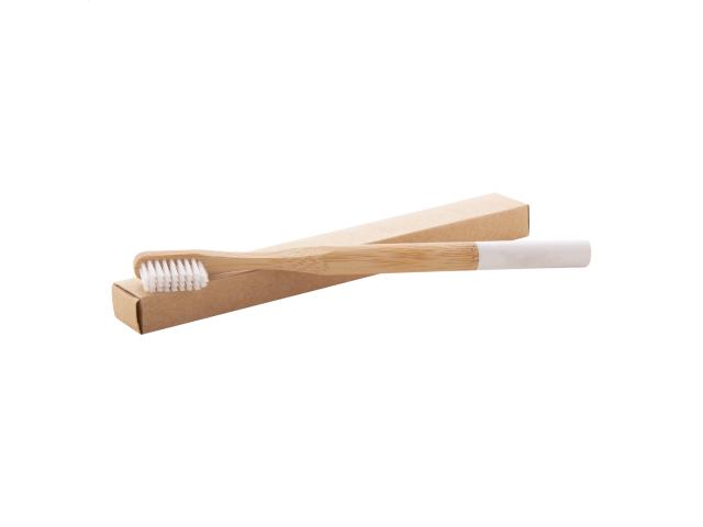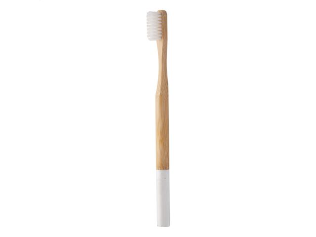 Adult toothbrush with natural bamboo handle and coloured nylon bristles. With matching colour decoration at the end of the handle. In kraft paper box.