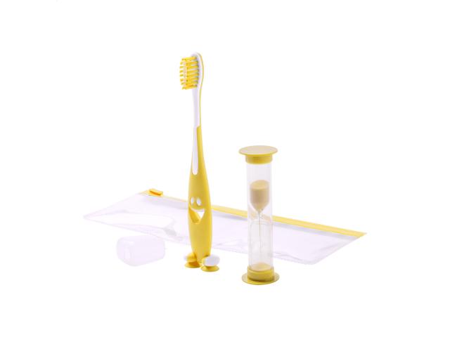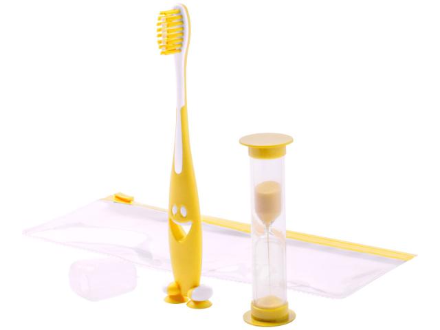 Toothbrush set for children with plastic toothbrush and sand timer. In zipped plastic case.