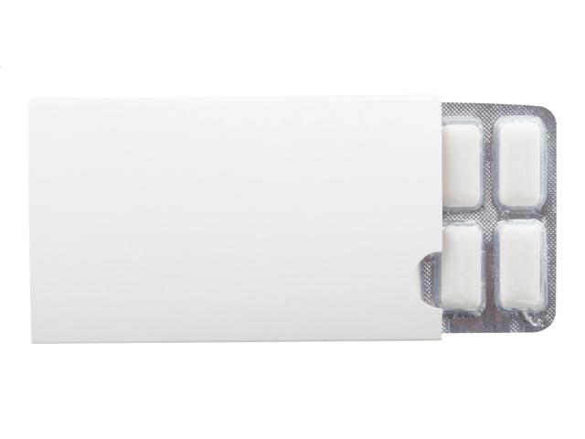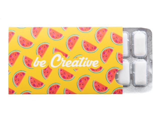 12 pcs sugarfree chewing gum in blister with custom made, full colour printed paper sleeve. MOQ: 100 pcs.