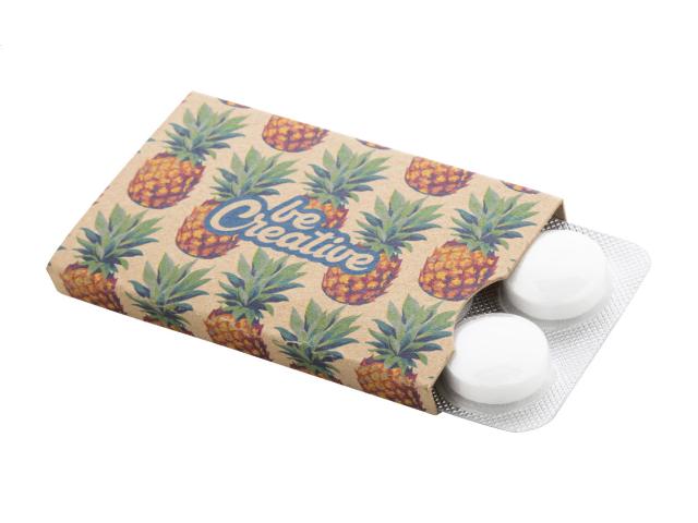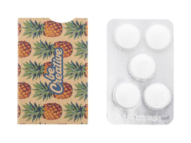 5 pcs large sized mint candies in blister with custom made, full colour printed kraft paper sleeve. MOQ: 100 pcs.