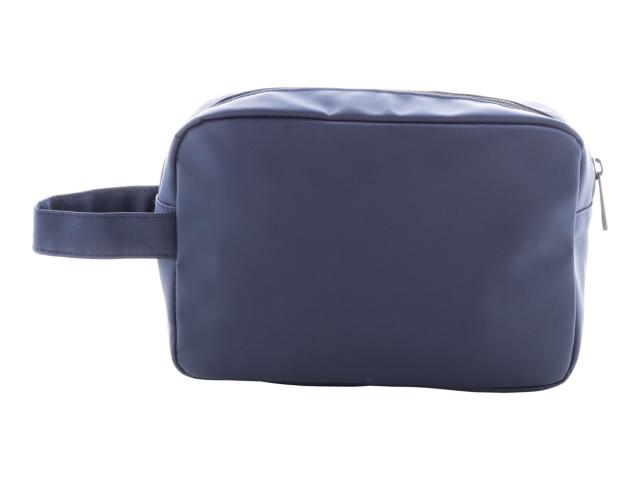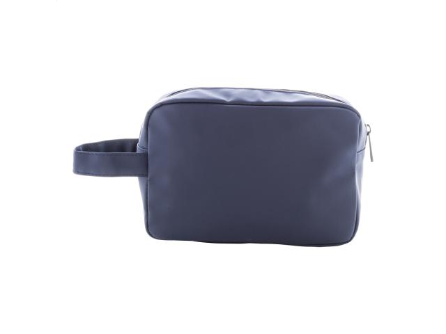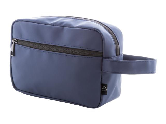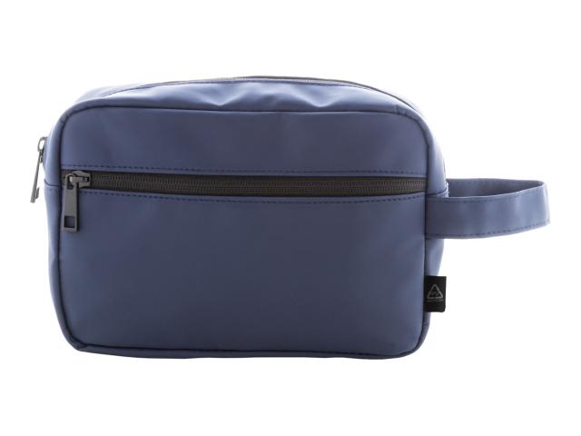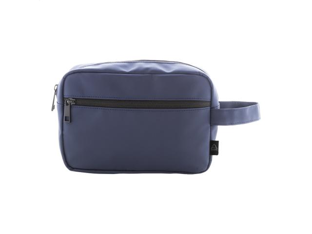 Soft recycled PU leather cosmetic bag with two zipped compartments and carry handle. With distinctive recycled PU label.