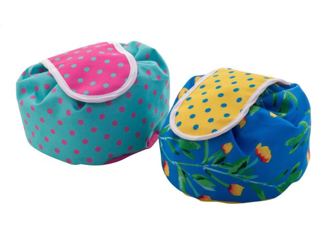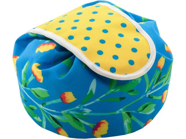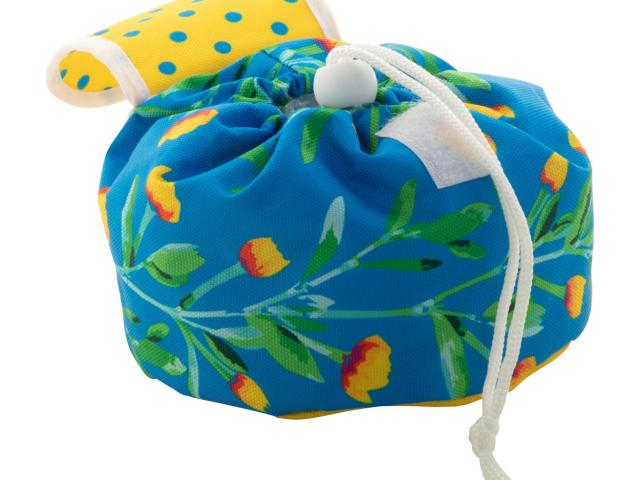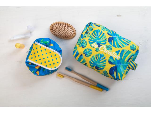 Custom made cosmetic bag in 600D RPET polyester with drawstring closure. With all-over sublimation printed graphics. MOQ: 50 pcs.