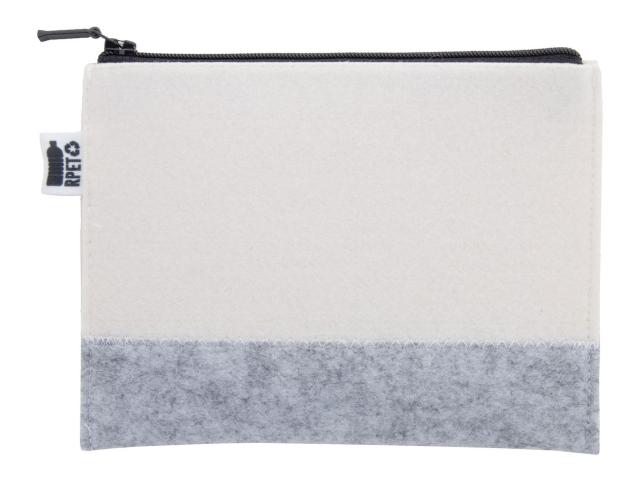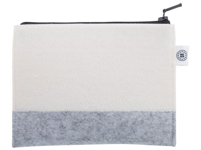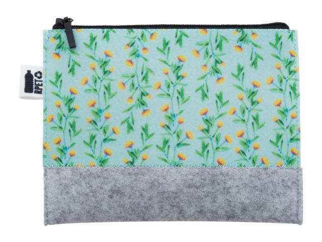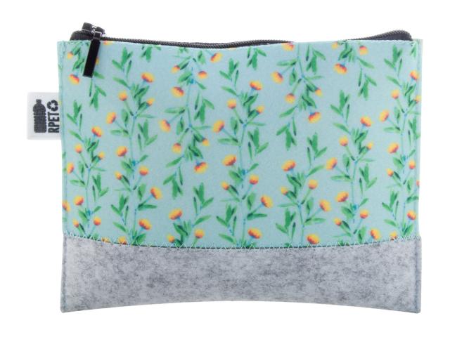 Custom made, zipped cosmetic bag in RPET felt with all-over sublimation printed graphics. With distinctive RPET label. MOQ: 50 pcs.