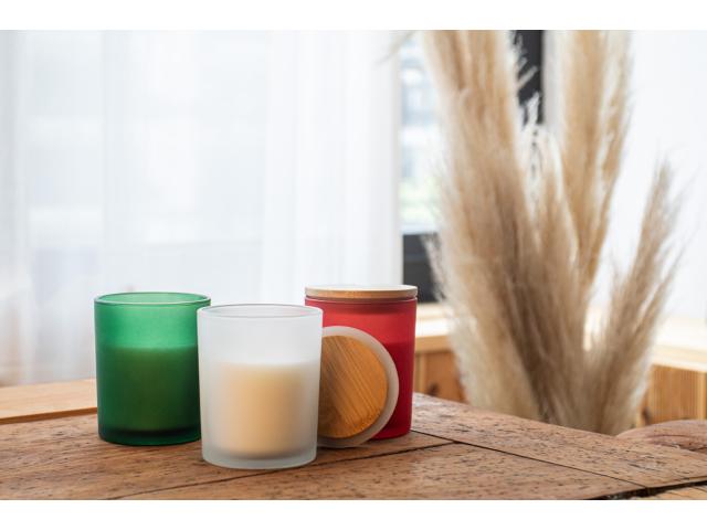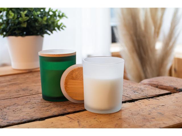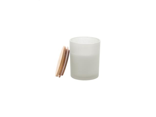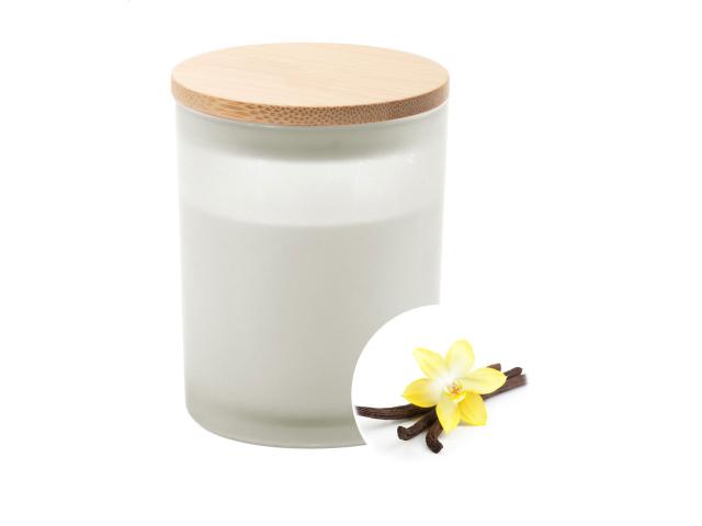 Scented plant-based wax candle in frosted glass holder with bamboo lid. With 120 grams of wax. In kraft paper box.