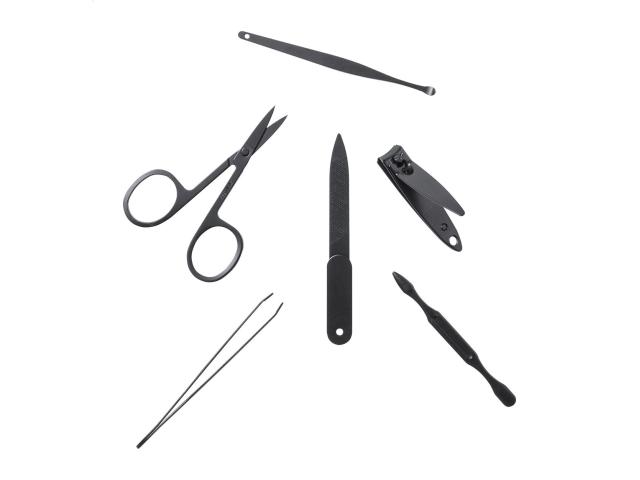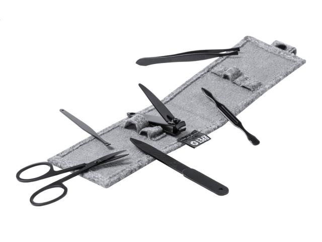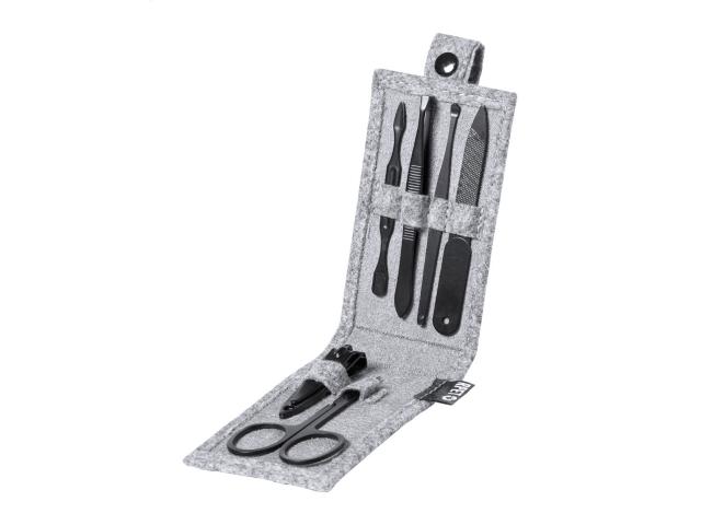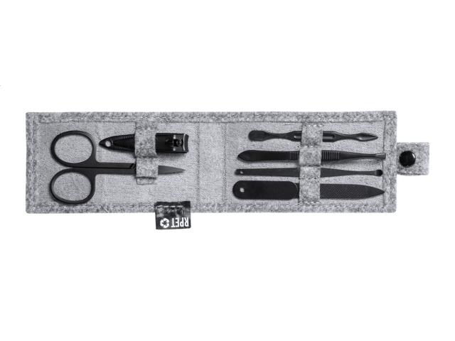 6 pc stainless steel manicure set in RPET felt case. Includes scissors, nail clipper, nail file, tweezers and 2 cuticle removers.