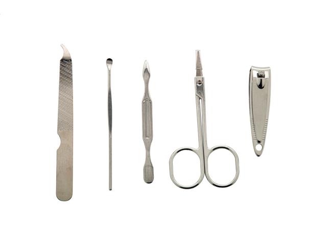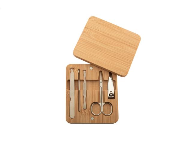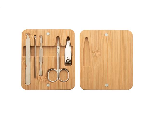 5 pc stainless steel manicure set in bamboo box with magnetic lid. Includes scissors, nail clipper, nail file and 2 cuticle removers.