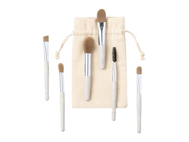6 pcs makeup brush set in ecological wheat straw and PP plastic, in cotton drawstring pouch.
