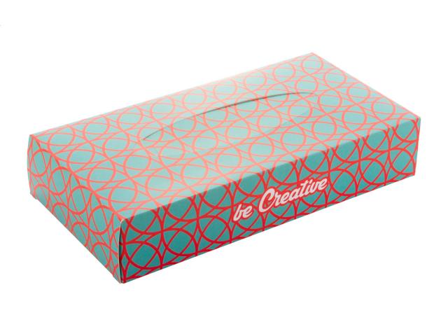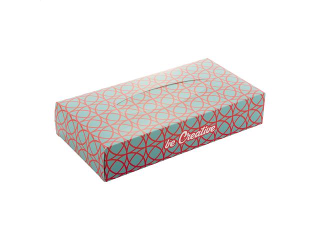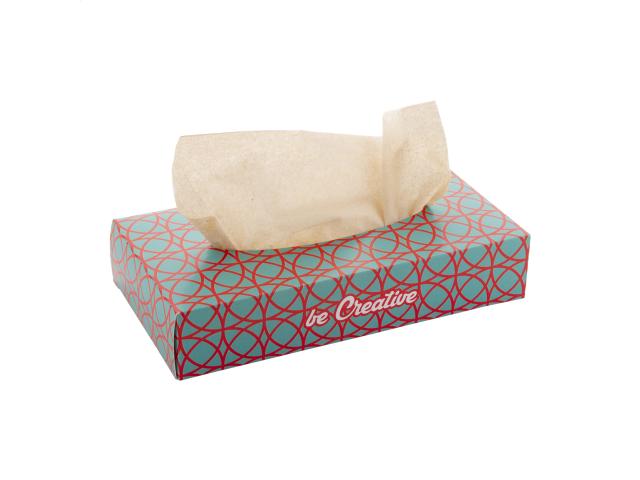 100 pcs of 2-ply recycled paper tissues in custom made paper dispenser box. Price includes full colour printing. MOQ: 100 pcs.