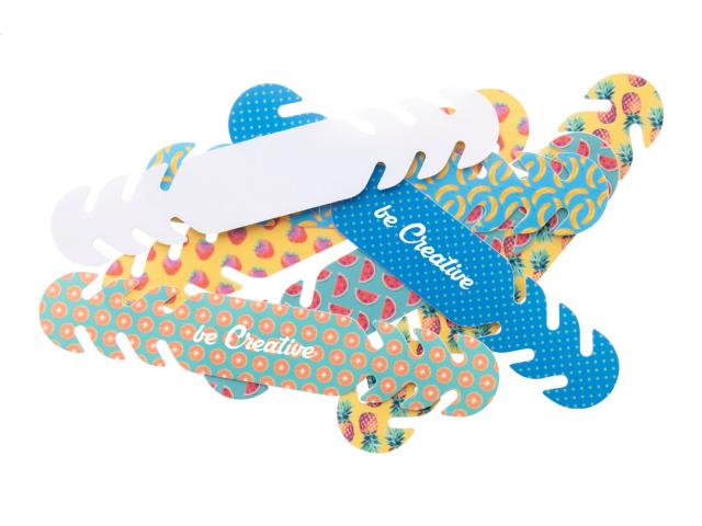 Custom made, full colour printed face mask extender in PP plastic. It is designed to release pressure caused by mask earloops. With 3 positions for 8, 11 and 14 cm extension. In universal size for adults. Price includes UV-LED printing on one side. MOQ: 2