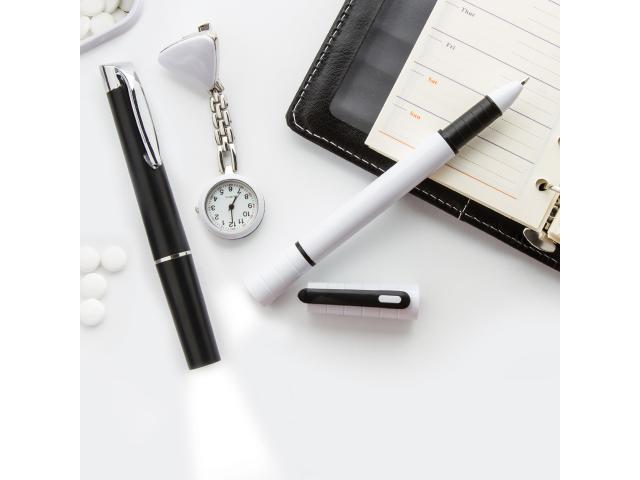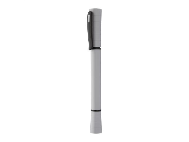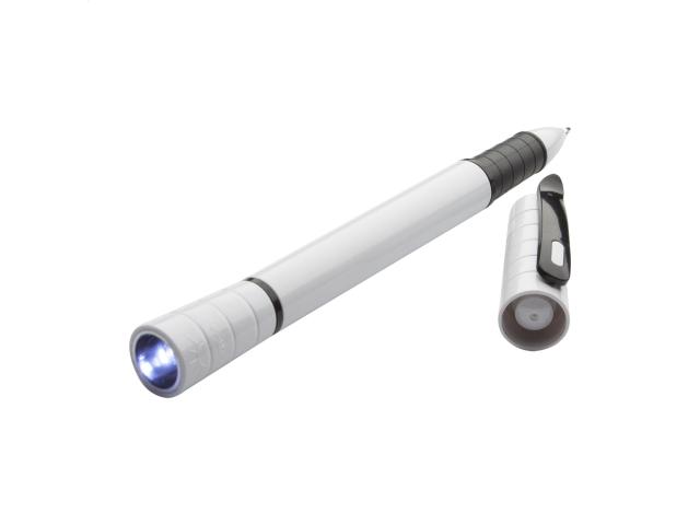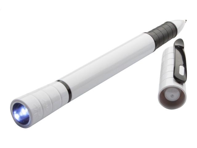 Plastic ballpoint pen with LED flashlight. Delivered with blue refill and button cell batteries.