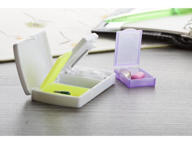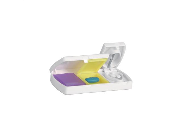 Plastic pillbox with 2 compartments and medicine cutter.