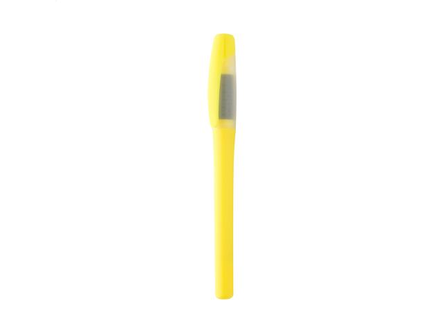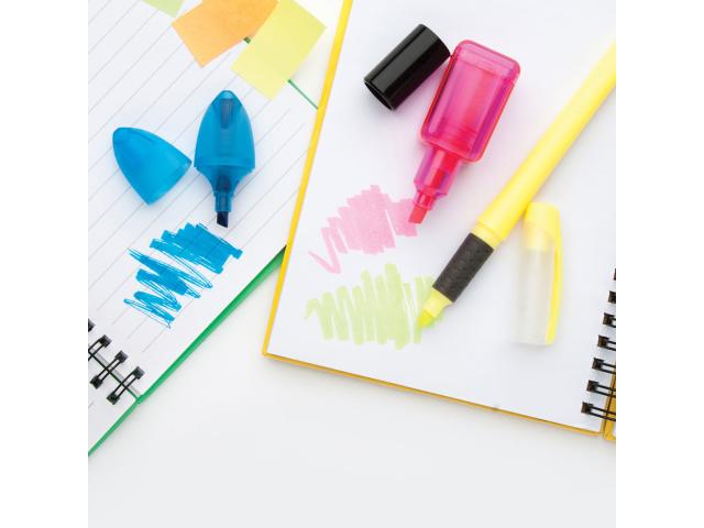 Plastic highlighter pen with cap and rubber grip. With matching colour highlighter refill.