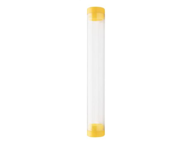 Transparent plastic tube pen case with coloured caps.