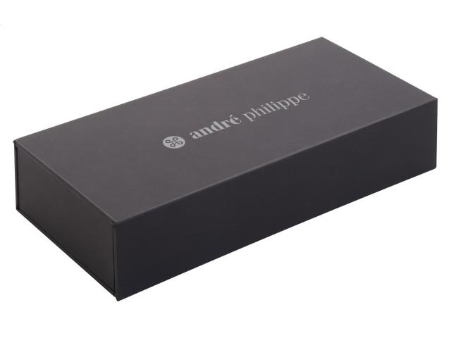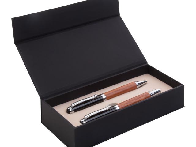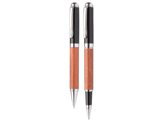 Elegant, metal ballpoint and roller pen set with rosewood barrel. In black gift box, with blue refill. André Philippe brand product.