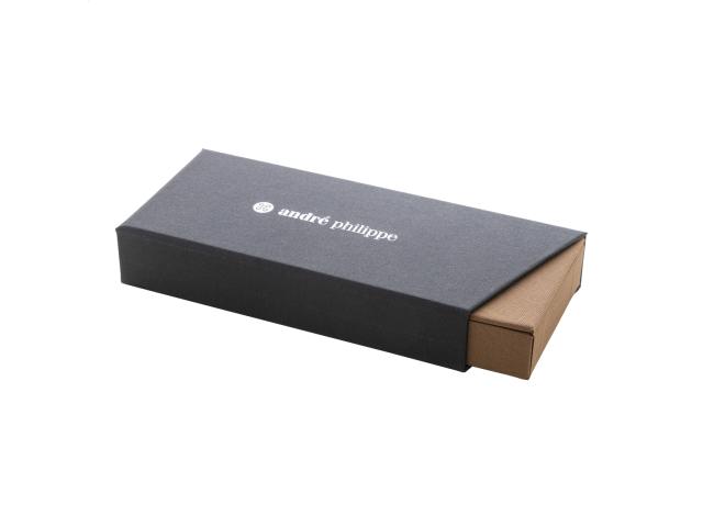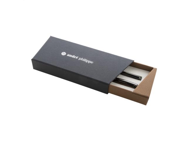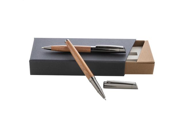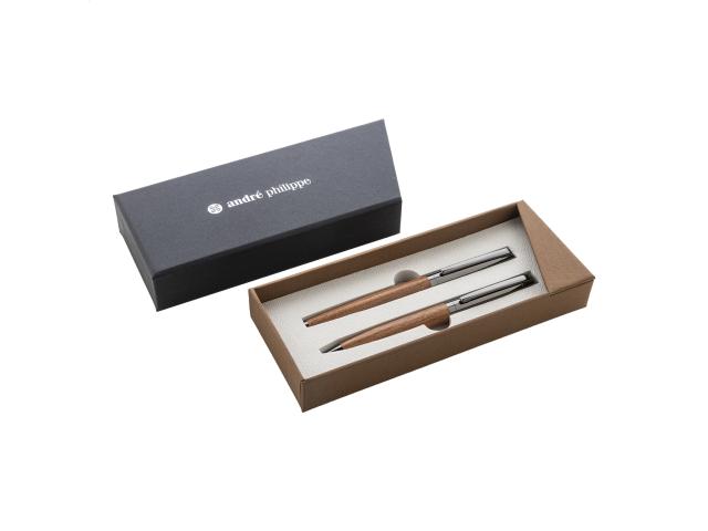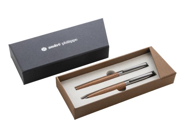 Elegant, metal ballpoint pen and roller pen set with wooden barrels and shiny gunmetal details. In two-tone gift box, with blue refill. André Philippe brand product.