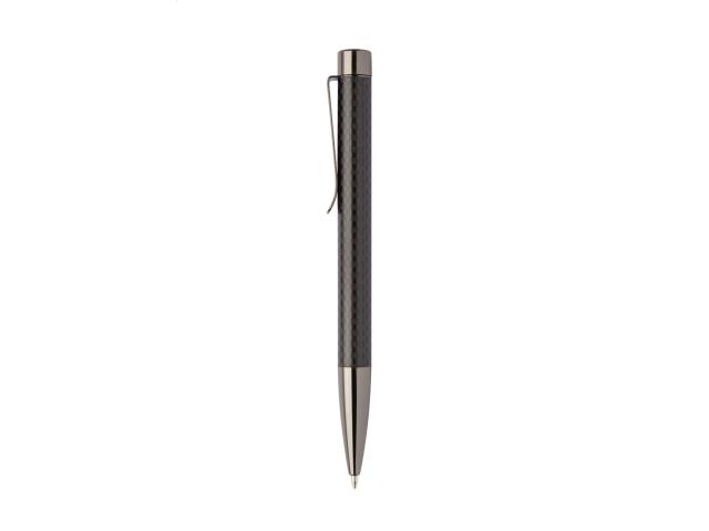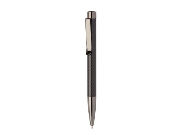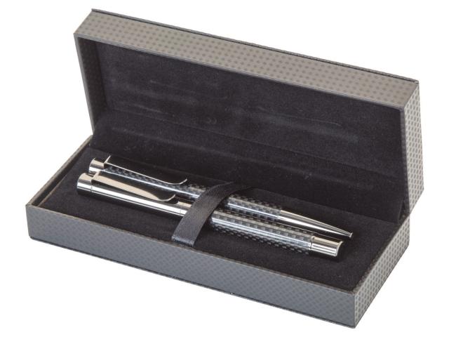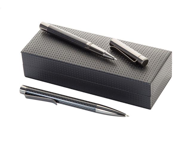 Elegant, metal ballpoint pen and roller pen set, with carbon patterned barrel and gunmetal finish parts. In carbon patterned gift box, with blue refill.