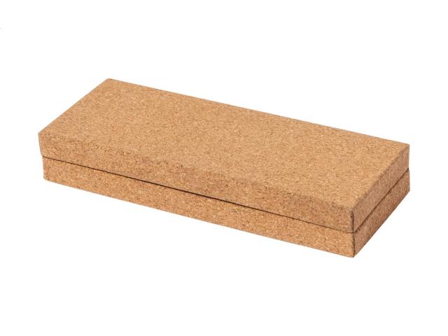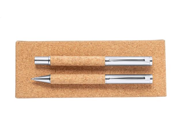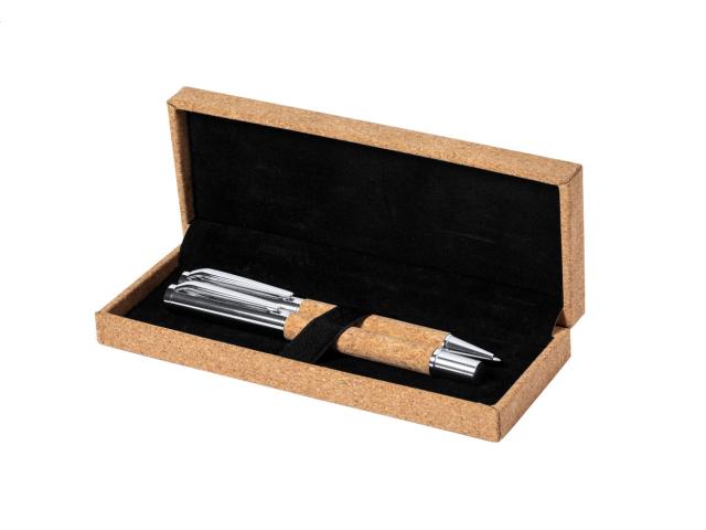Elegant, metal ballpoint and roller pen set with natural cork covered barrel. In natural cork gift box, with blue refill.