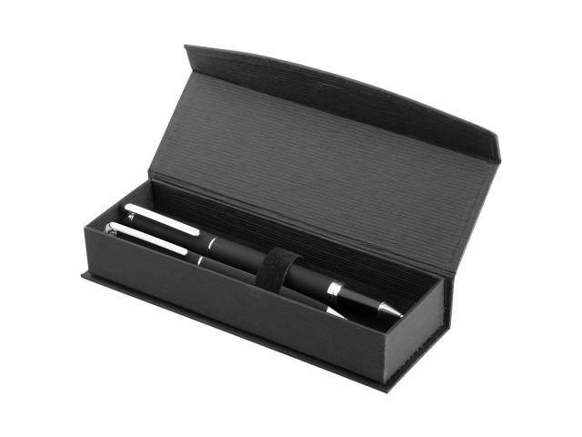 Metal ballpoint pen and roller pen with rubberized finish. In magnetic, paper gift box. With black refill.
