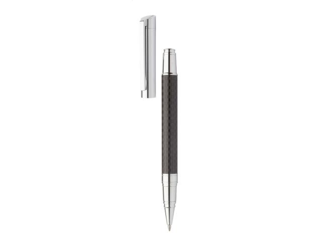 Elegant, metal ballpoint pen and roller pen set, with carbon pattern barrel and shiny chrome parts. In black gift box, with blue refill. André Philippe brand product.