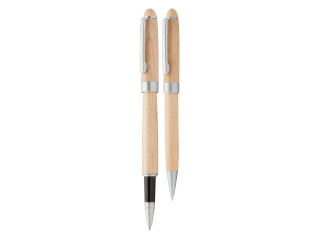 Natural colour wooden pen set with ballpoint pen and roller pen in gift box. With blue refill.