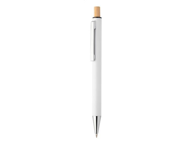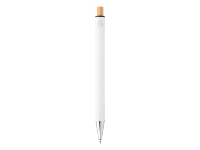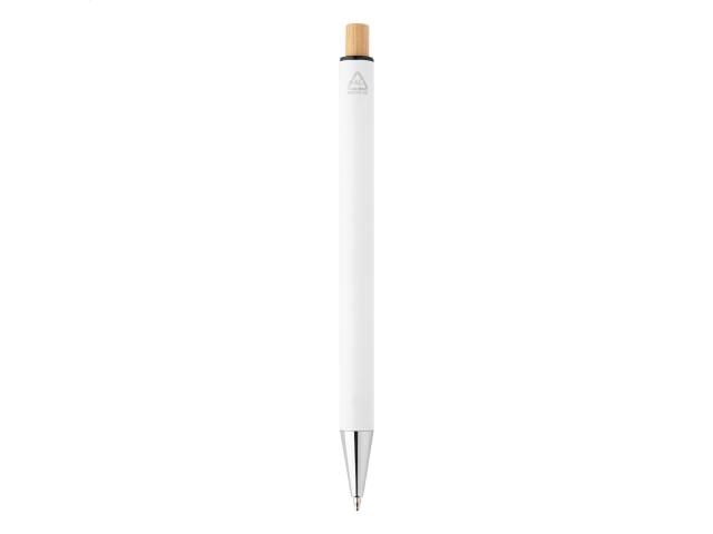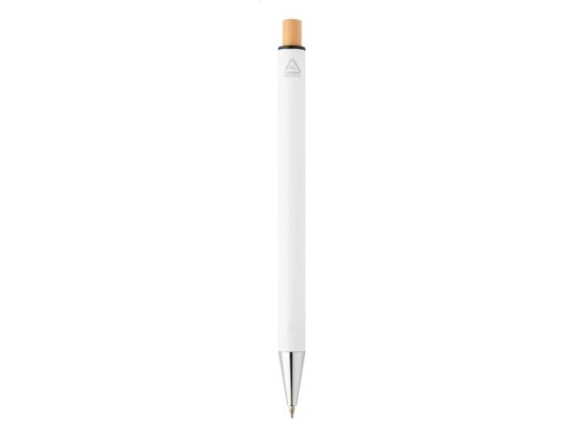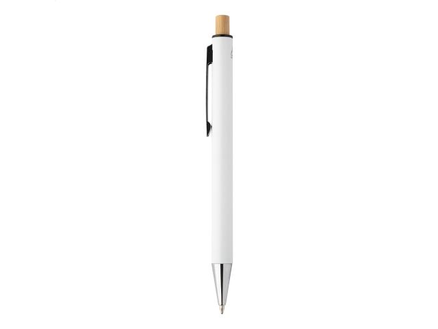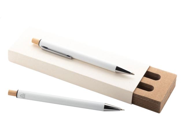Recycled aluminium pen set with ballpoint pen and mechanical pencil with bamboo buttons. With blue refill and 0,7 mm leads. In kraft paper box.