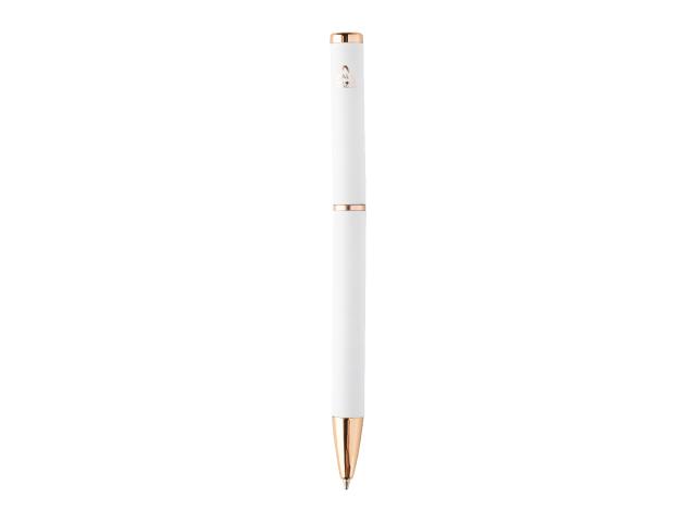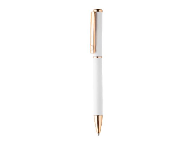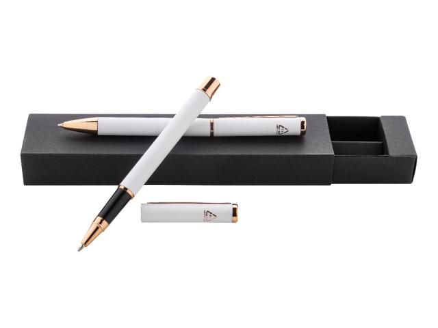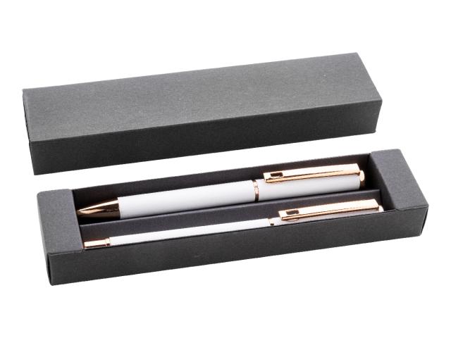 Recycled aluminium pen set with ballpoint pen and roller pen with rubberized finish and rose gold details. With blue refill. With special coating for mirror laser engraving in rose gold colour. In black paper gift box.