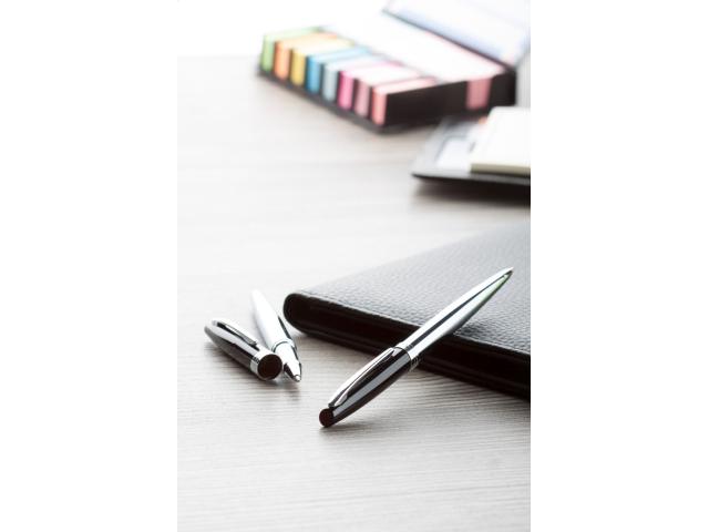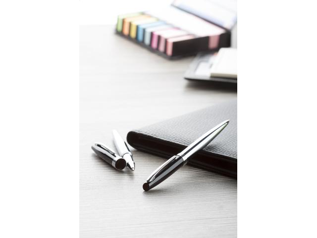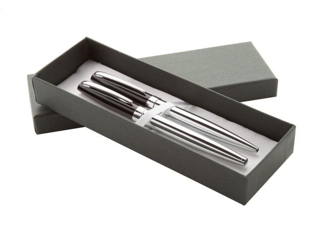 Metal ballpoint pen and roller pen with black lacquered cap and shiny chrome barrel and clip. In gift box, with blue refill.