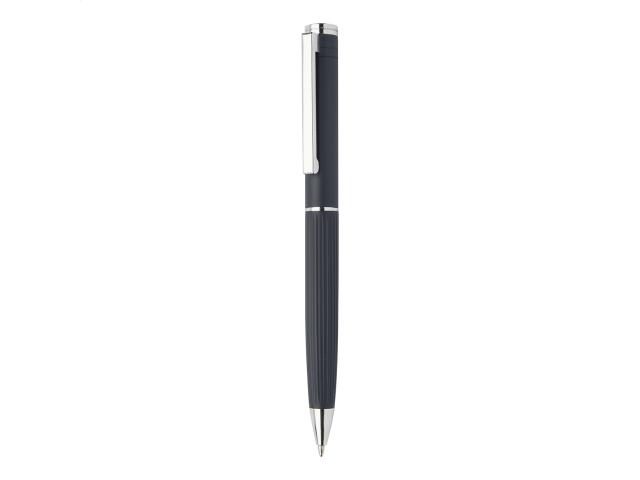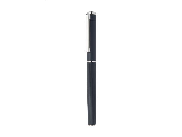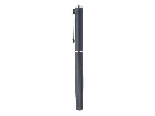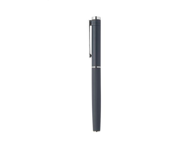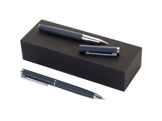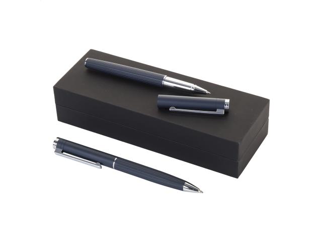 Elegant, aluminium ballpoint pen and roller pen set with stripe textured barrel. In black gift box, with blue refill.