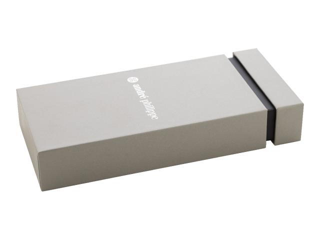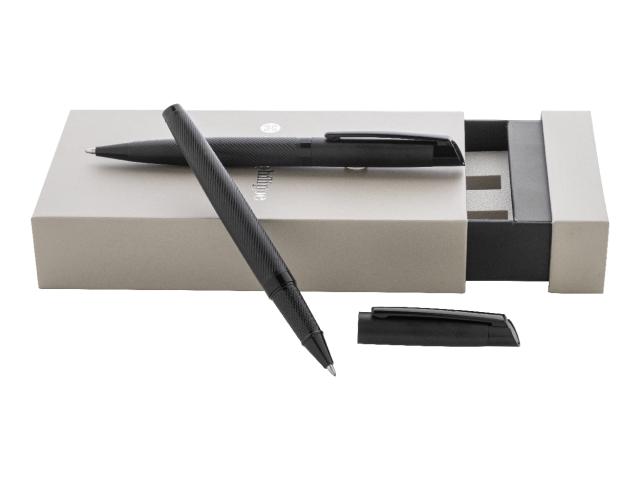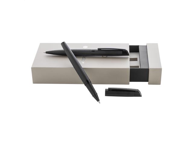 Elegant, metal ballpoint pen and roller pen set with diagonally textured barrels. In two-tone gift box, with blue refill. André Philippe brand product.