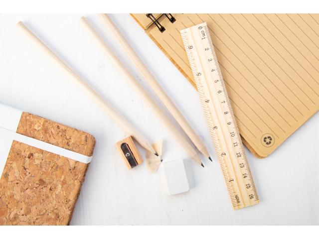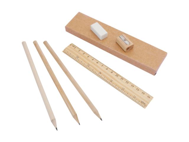 3 lead pencils, ruler, sharpener and eraser in cardboard box.