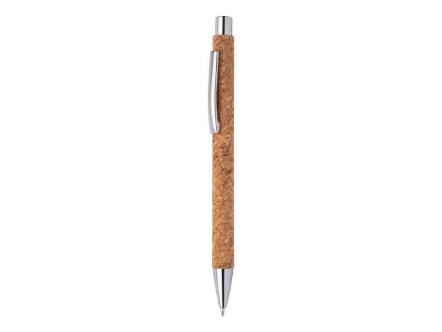 Natural cork covered recycled paper ballpoint pen with metal parts. With blue refill.