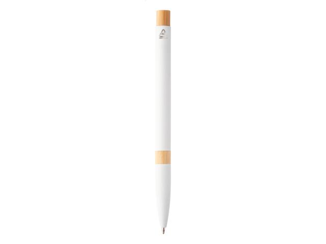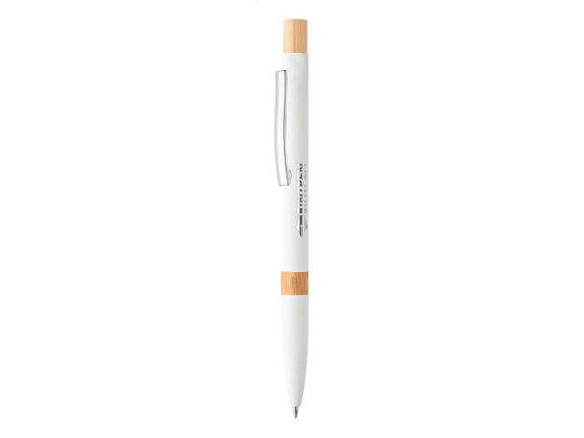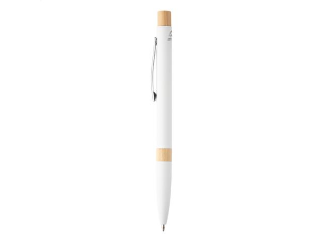 Recycled aluminium ballpoint pen with bamboo parts, rubberized finish and chrome clip. With special coating for mirror laser engraving. With blue refill.