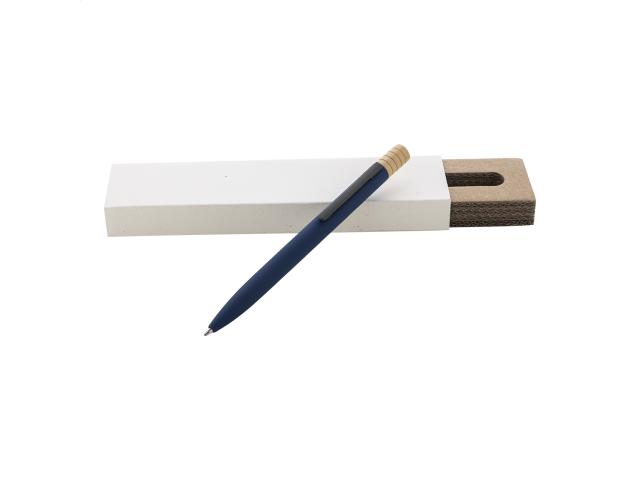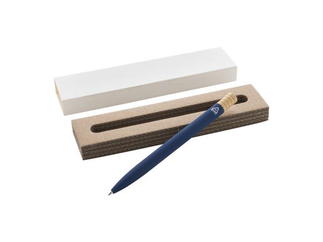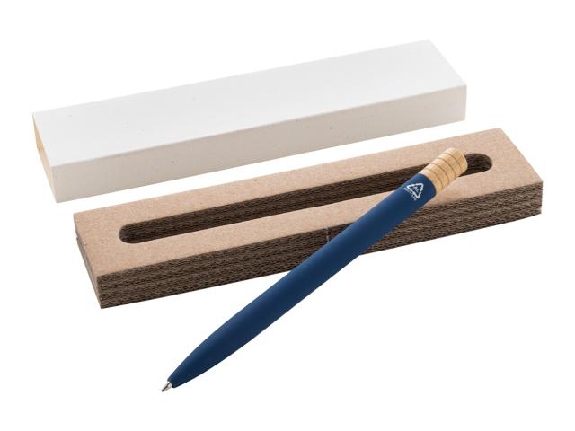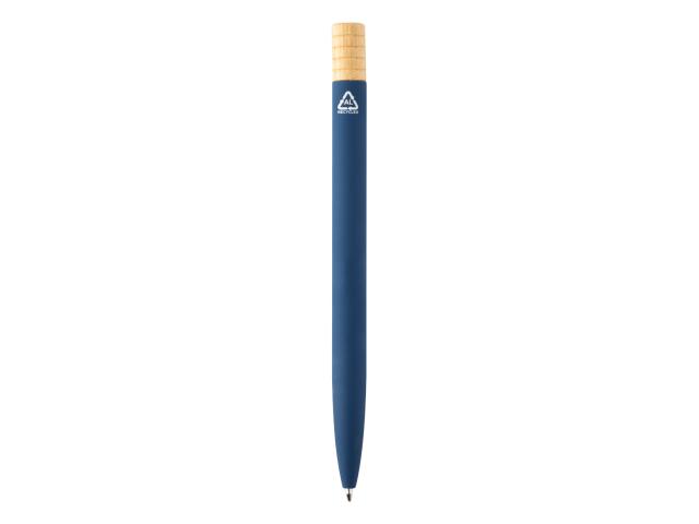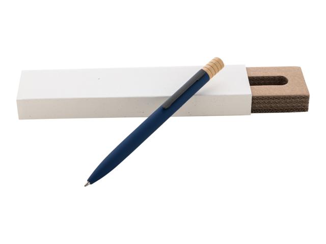 Recycled aluminium twist ballpoint pen with gunmetal finish clip and bamboo top. With blue refill. In kraft paper box.