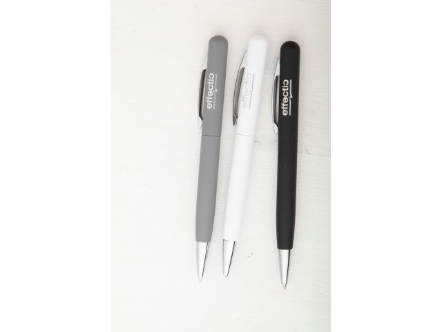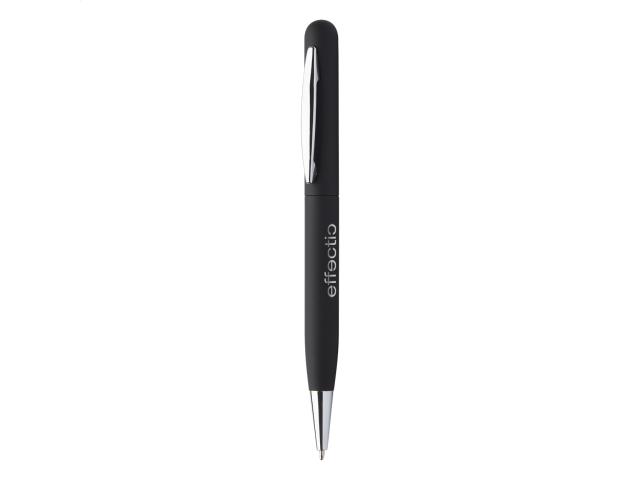 Metal twist ballpoint pen with rubberized finish and blue refill. With special coating for mirror laser engraving.