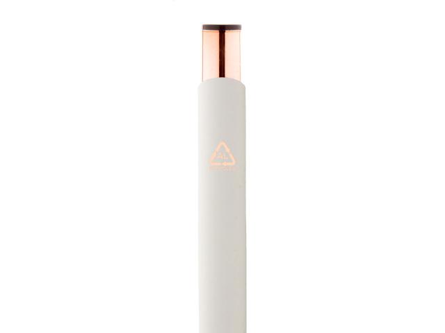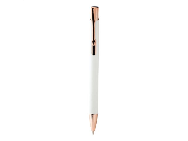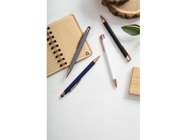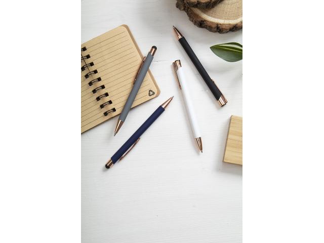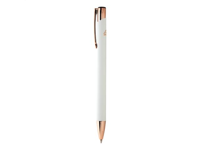 Recycled aluminium ballpoint pen with rubberized finish and rose gold details. With special coating for mirror laser engraving in rose gold colour. With blue refill.