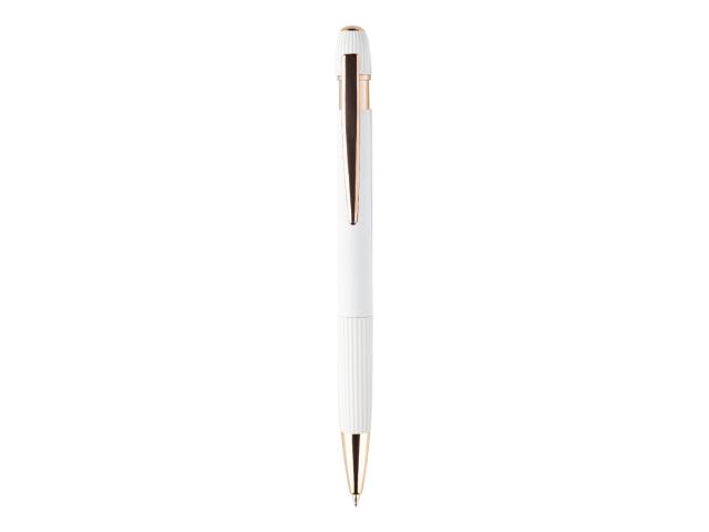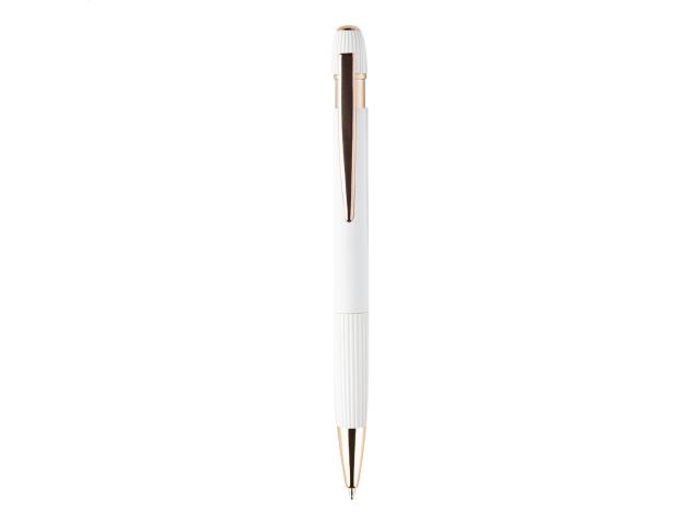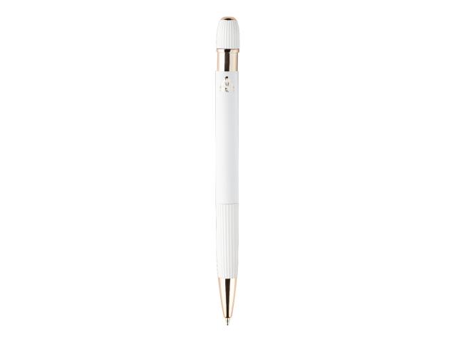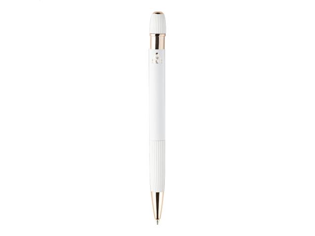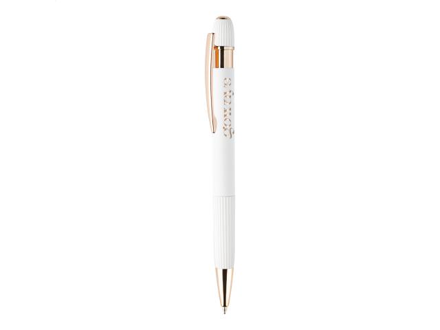 Recycled aluminium ballpoint pen with rubberized body and rose gold details. With special coating for mirror laser engraving in rose gold colour. With blue refill.