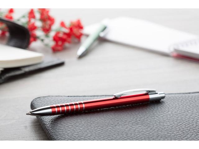 Aluminium ballpoint pen with rings, with chrome clip and tip. With blue refill.