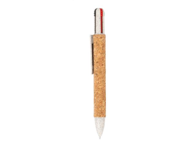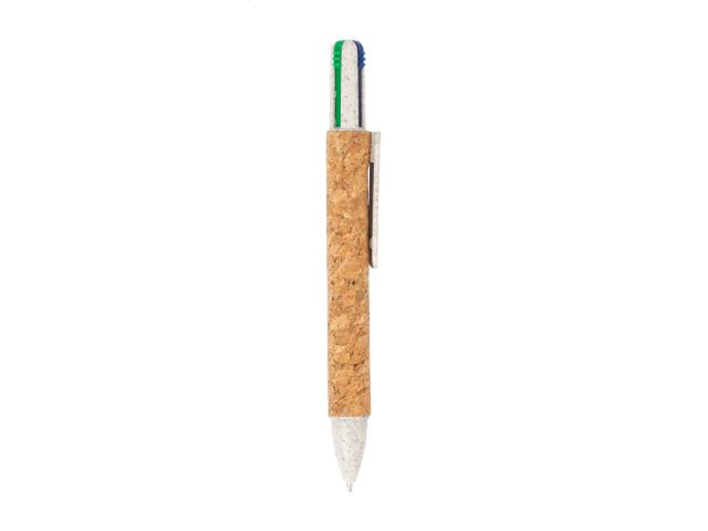 Ecological wheat straw plastic ballpoint pen with natural cork covered barrel. With 4 coloured refills: black, blue, green and red.