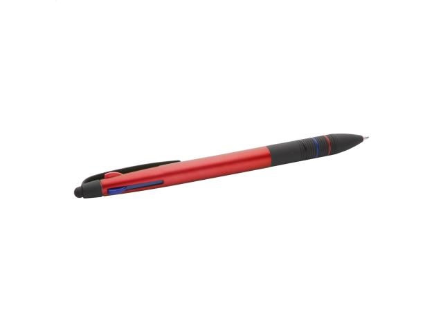 Plastic ballpoint and touch screen pen with rubberized grip and matte metallic finish. With 3 coloured refills: black, blue and red.