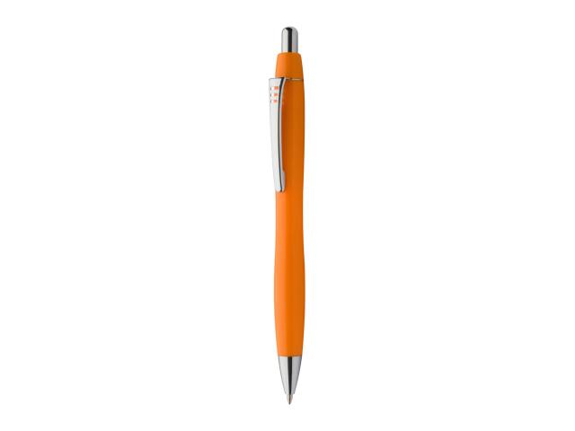 Plastic ballpoint pen with solid barrel, metal clip, chrome tip and button. With blue refill.