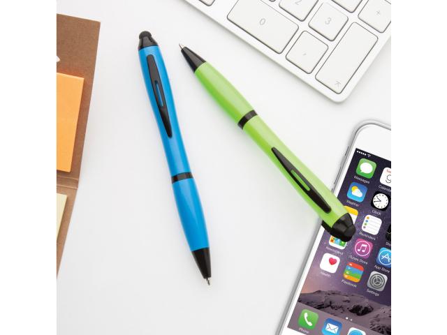 Plastic ballpoint and touch screen pen with coloured barrel and grip, and black parts. With blue refill.