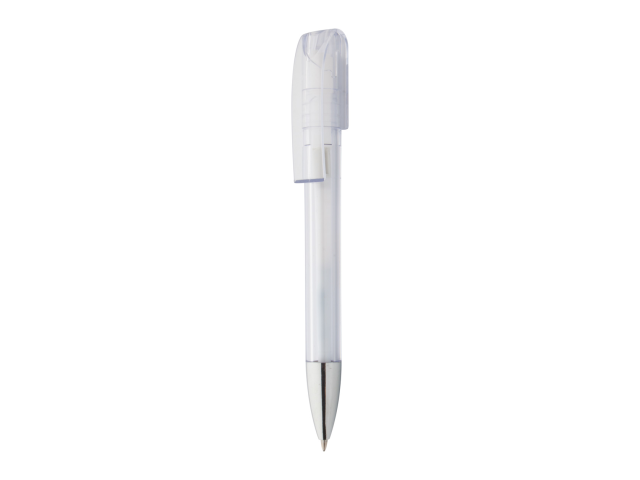 Plastic ballpoint pen in transparent colour, with chrome tip and blue refill.