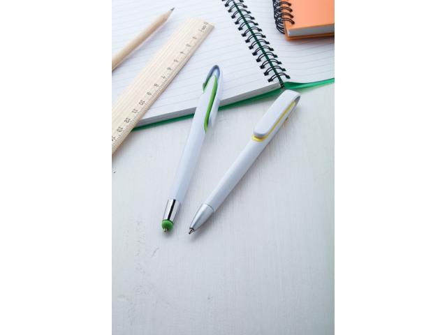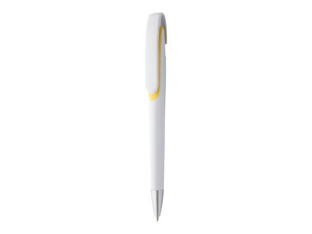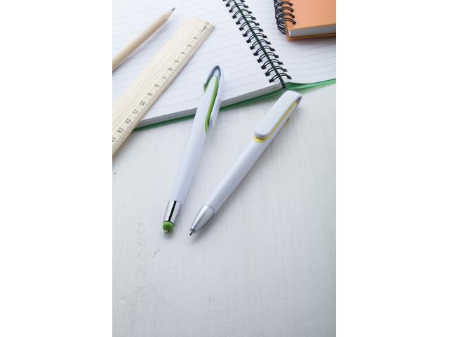 Plastic ballpoint pen with white barrel and silver tip. With blue refill.