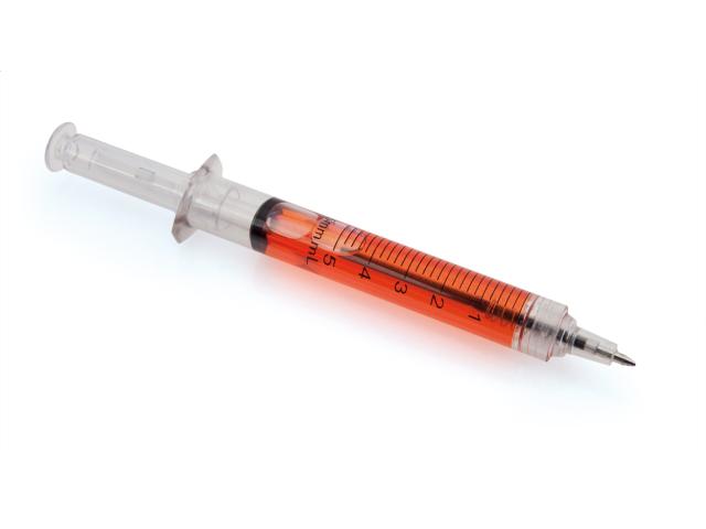 Syringe shaped plastic ballpoint pen with liquid filled transparent body. With blue refill.
