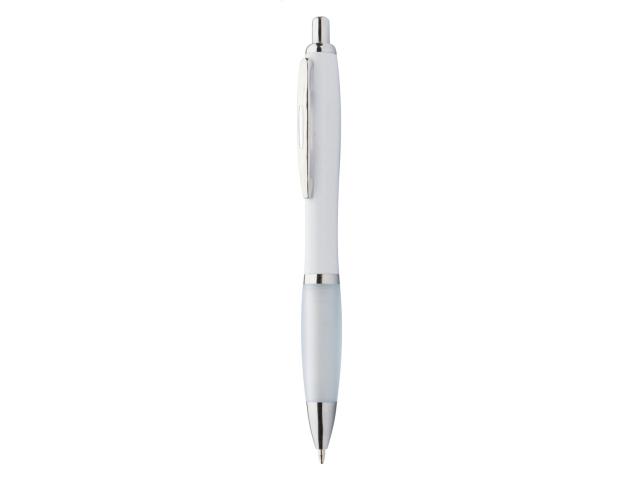 Plastic ballpoint pen with white barrel, coloured grip and shiny chrome parts. With blue refill.