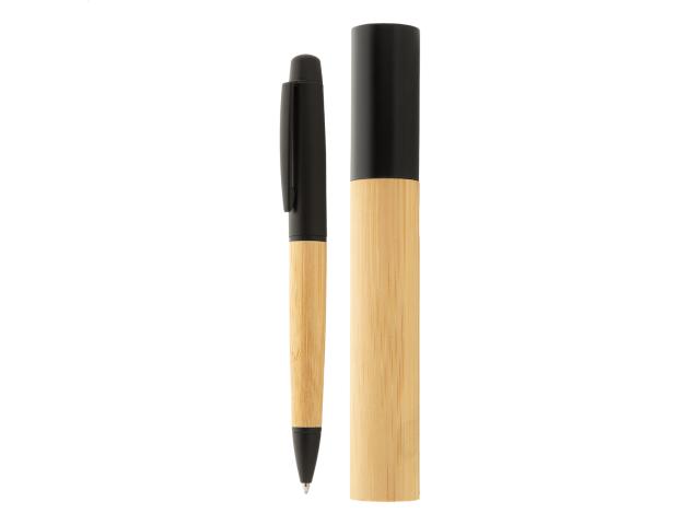 Elegant, black metal twist ballpoint pen with bamboo barrel and black parts. In bamboo tube case with black cap. With blue refill.