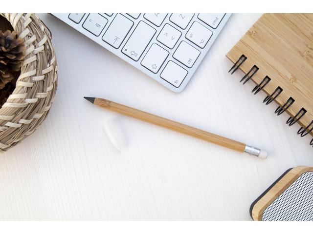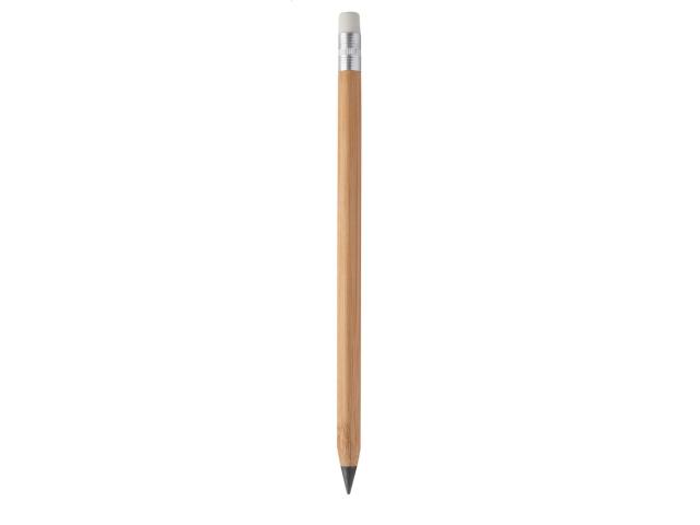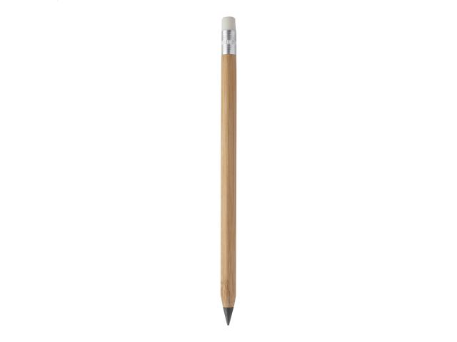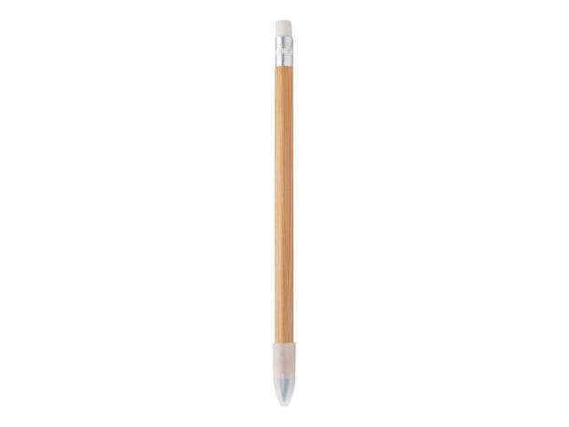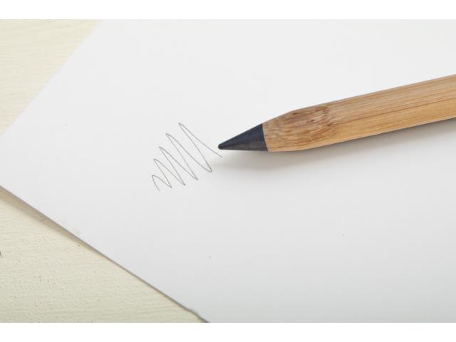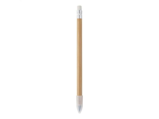 Long-lasting inkless bamboo pen with white eraser and metal alloy tip, which oxidizes the paper. This pen writes similarly to a pencil, and it is also erasable.