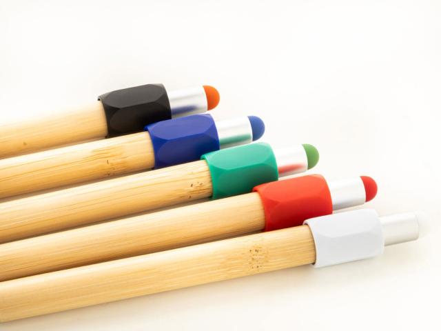Bamboo ballpoint and touch screen pen with recycled ABS plastic fidget spinner. With blue refill.